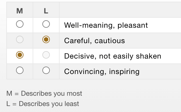 Questionnaires usually take about 10 minutes each and are done online. The results can be sent to you and/or your organisation's stakeholders immediately in a .pdf DISC Behavioural Report. Depending on the product used, individuals answer a range of around 24 questions. The questionnaire forces an individual to choose between two descriptions from a selection of phrases. Individuals choose ONE word, word-pair, or phrase that is "most" like them and then another from the same group that is "least" like them.